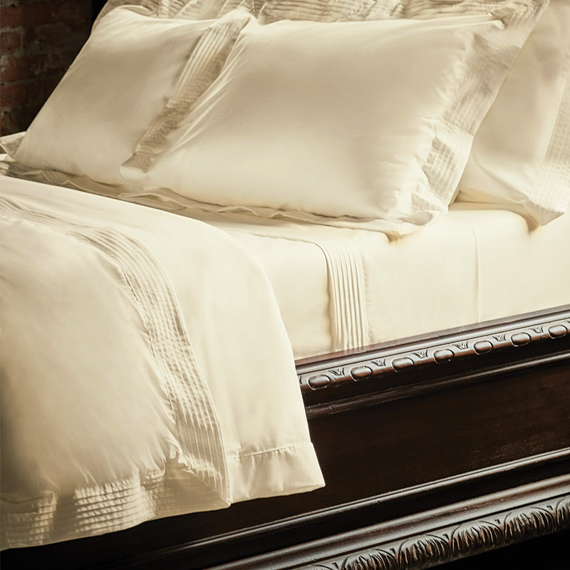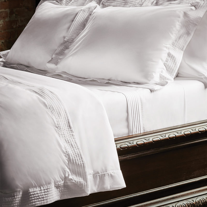 Tranquillo bedding features 100% Supima® cotton, a premium fiber grown exclusively in the USA, to attain utmost quality and softness. Tranquillo is notable for its crisp cool percale touch. To add texture and interest, Tranquillo is trimmed with a quadruple-pleated hem. Tranquillo’s most unique feature is its innovative, proprietary finish that resists wrinkles.